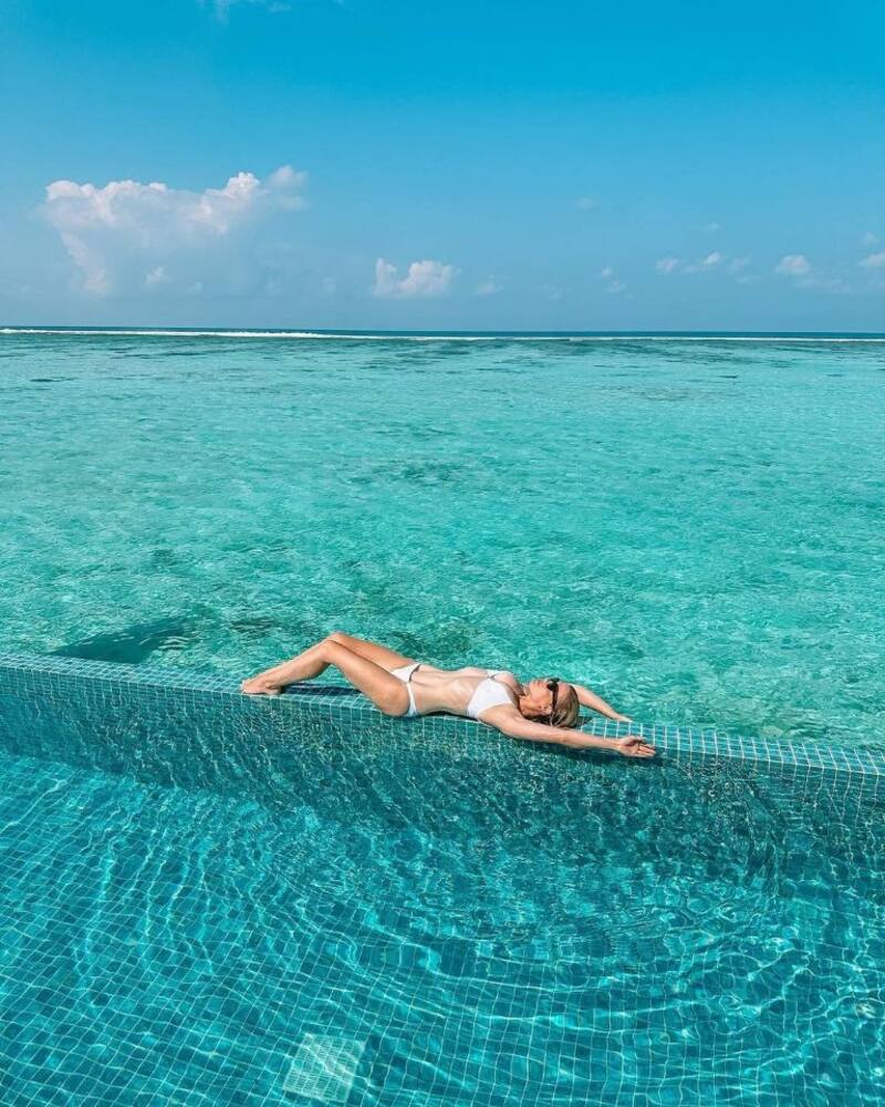 “Semana dos de luna de miel en el paraíso @conrad_maldives #conradmaldives #conradhotels #themuraka”, escribió la modelo, quien para sus postales eligió un discreto traje de baño de dos piezas en color blanco y un vestido primaveral con detalles de flores.
