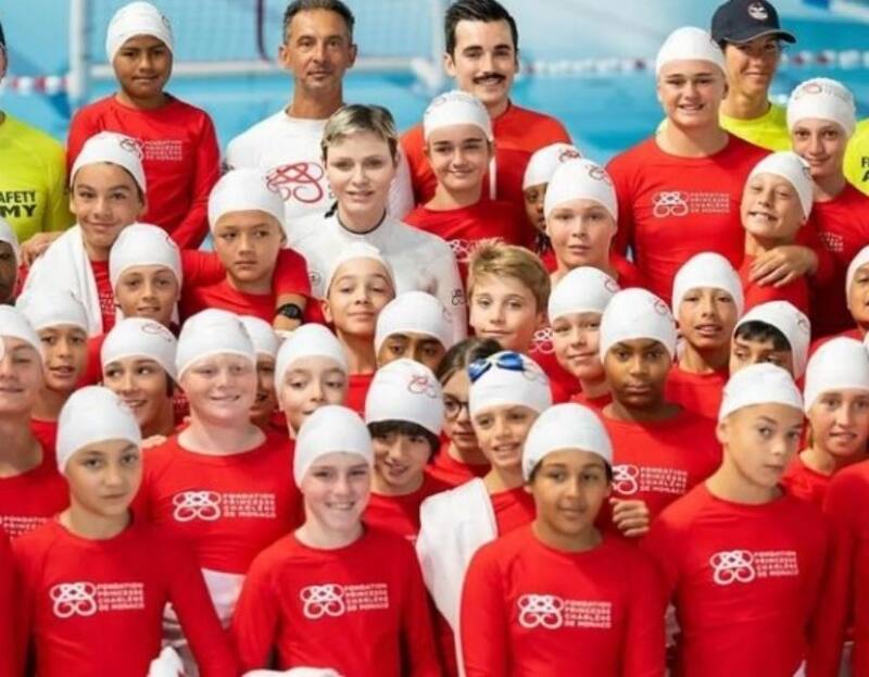 La princesa Charlene compartió con los niños que participaron en actividades de rescate acuático, que fueron propuestas por la propia ex nadadora olímpica de relevos en Sydney 2000.