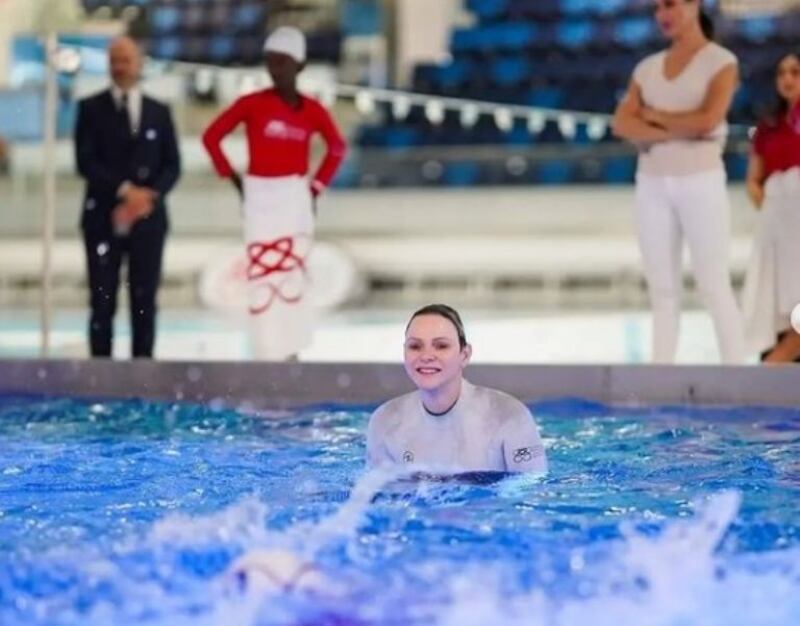 La princesa Charlene se volvió a poner el traje de baño este viernes para ingresar a la piscina del Stade Louis II para enseñar las bases de la natación a los 85 niños que participarán en el torneo de rugby Sainte Dévote. esta vez, el ausente fue el príncipe Alberto de Mónaco.