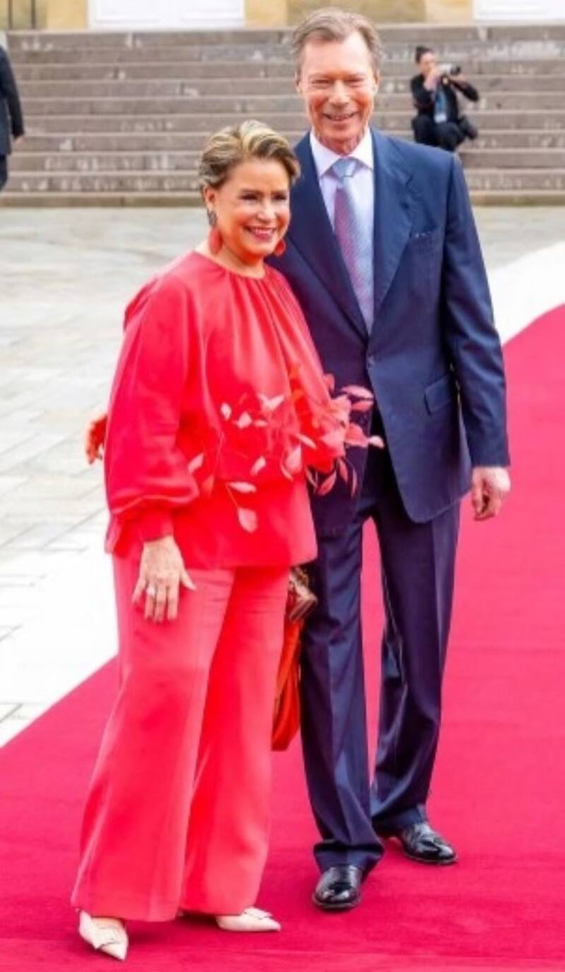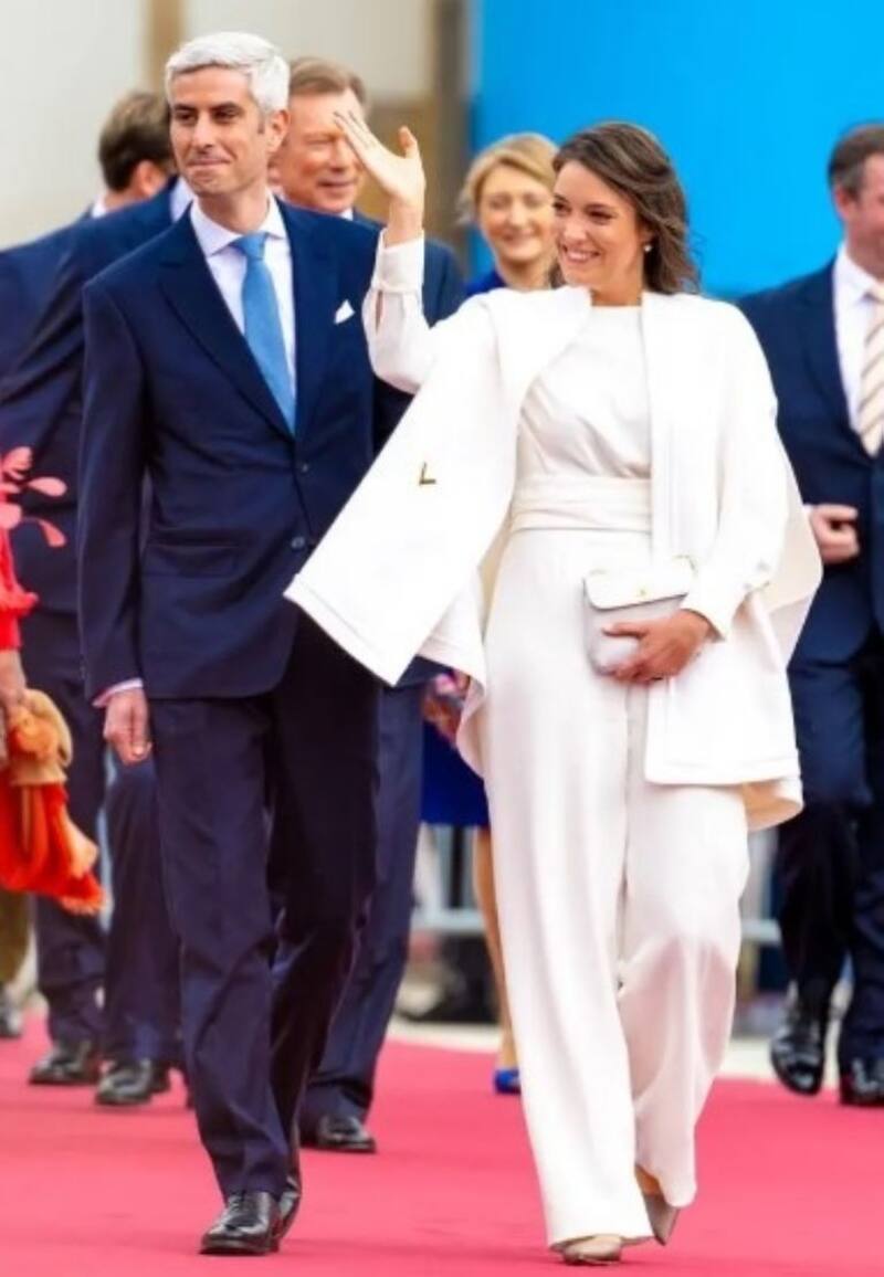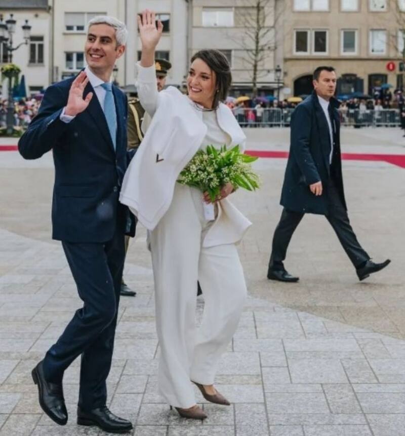 Alejandra de Luxemburgo vistió un traje dos piezas con pantalón de tiro alto y cintura estilo fajín, que acompañó con una chaqueta tipo capa. Su cabello recogido y el estilo minimalista hizo sobresalir el ramo de rosas que portaba en sus manos al término de la ceremonia.