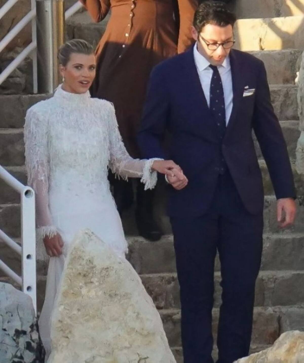 Sofia Richie brilló con un vestido de novia personalizado de Chanel que tenía una cola adornada con cuentas blancas y tornasoles, mientras que el novio lució un ajustado esmoquín. La novia usó tres atuendos personalizados para la celebración de su boda, que se había probado en los salones de alta costura de Chanel en París. Entre los invitados al matrimonio sobresalieron Paris Hilton y su esposo, Carter Reum, y la actriz Cameron Diaz con su marido Benji Madden.
