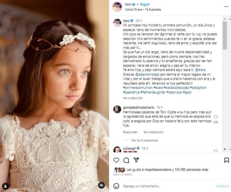 “Mi princesa hoy hiciste tu primera comunión, un día único y especial lleno de momentos inolvidables. Mis ojos se llenaron de lágrimas al verte con tu luz, no puedo describir mis sentimientos cuando te vi en la iglesia, estabas radiante, me sentí orgulloso, lleno de amor y exploté una vez más por ti”, agregó Toni en el texto.