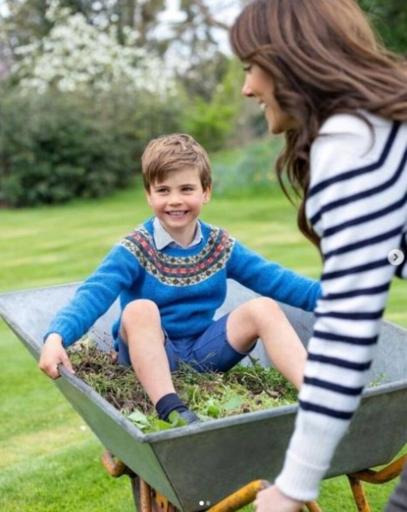 El Príncipe Louis cumple cinco años el domingo 23 de abril y sus padres publicaron una dulce fotografía del joven Louis siendo empujado en una carretilla por Kate, mientras vestía un suéter de lana azul y sus clásicos pantalones cortos.