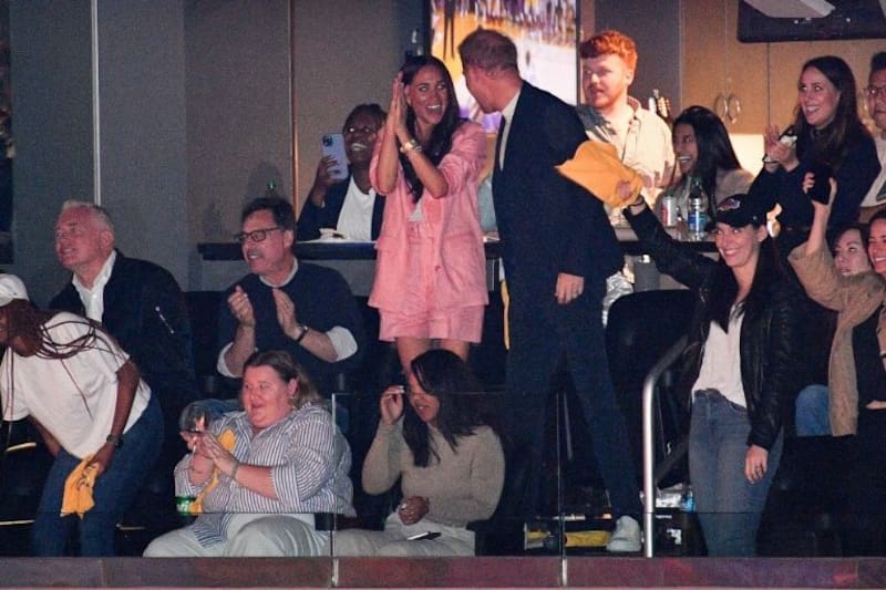Meghan y Harry aparecieron en la pantalla sobre la cancha y parecían burlarse como si hubiera sido una "cámara de besos". Harry hizo el ademán de inclinarse antes de largarse a reír.