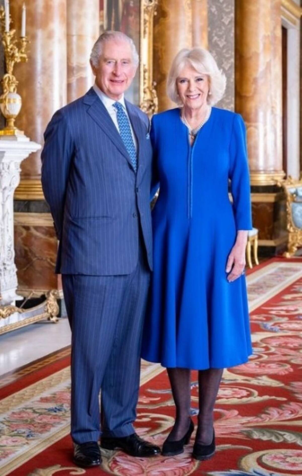 Carlos aparece vestido con un traje azul de Anderson and Sheppard, con una corbata azul y una camisa Turnbull and Asser blanca. Camila lleva un vestido abrigo de crepé de lana azul de la diseñadora británica Fiona Clare, el juego de pendientes colgantes de perlas de la difunta Reina Isabel II adornado con piedras preciosas de zafiro y rubí, y un collar de perlas de su colección privada.