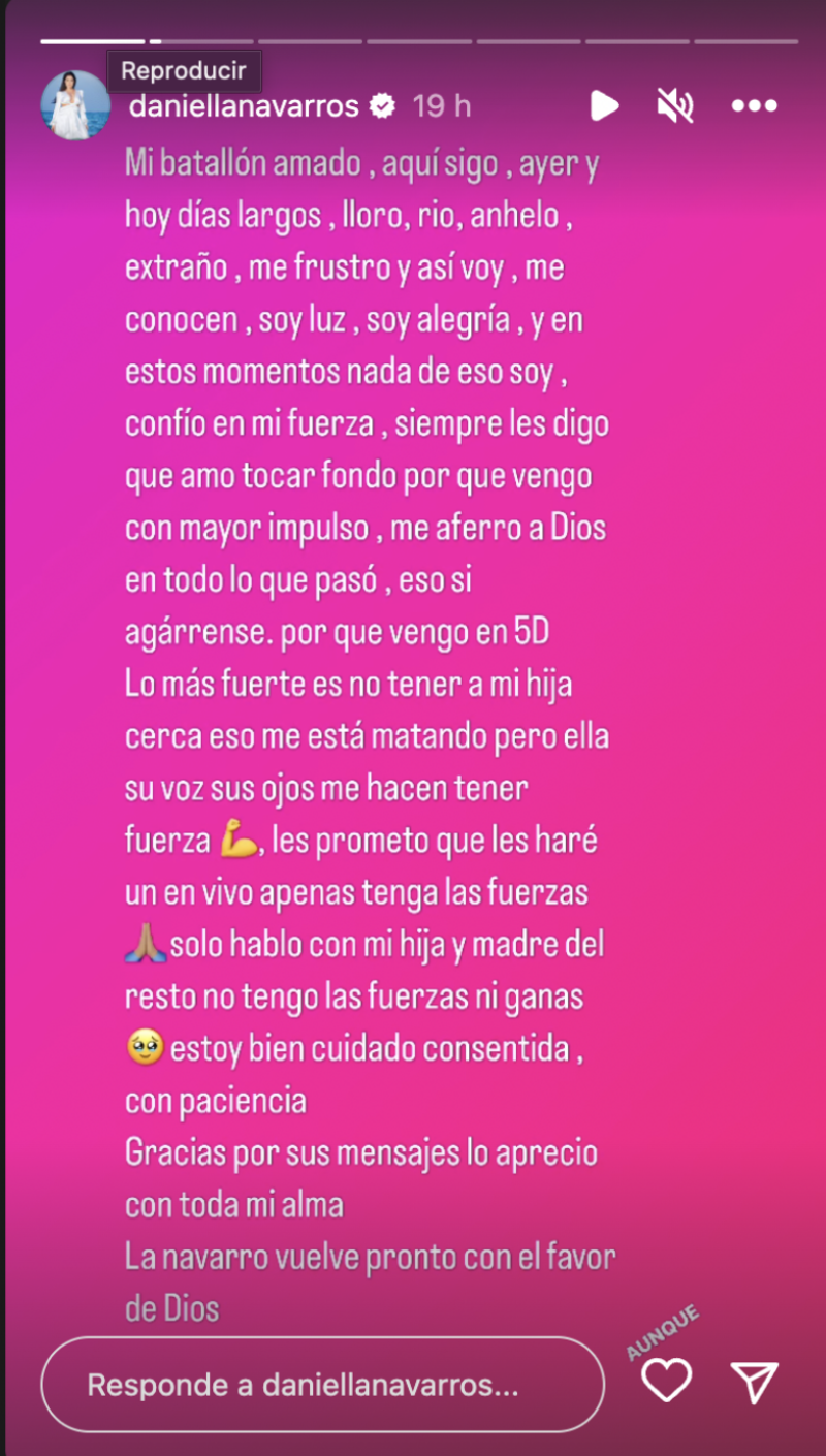 "Amo tocar fondo porque vengo con mayor impulso, me aferro a Dios en todo lo que pasó. Eso sí, agárrense porque vengo en 5D. Lo más fuerte es no tener a mi hija cerca, eso me está matando", agregó Daniella.