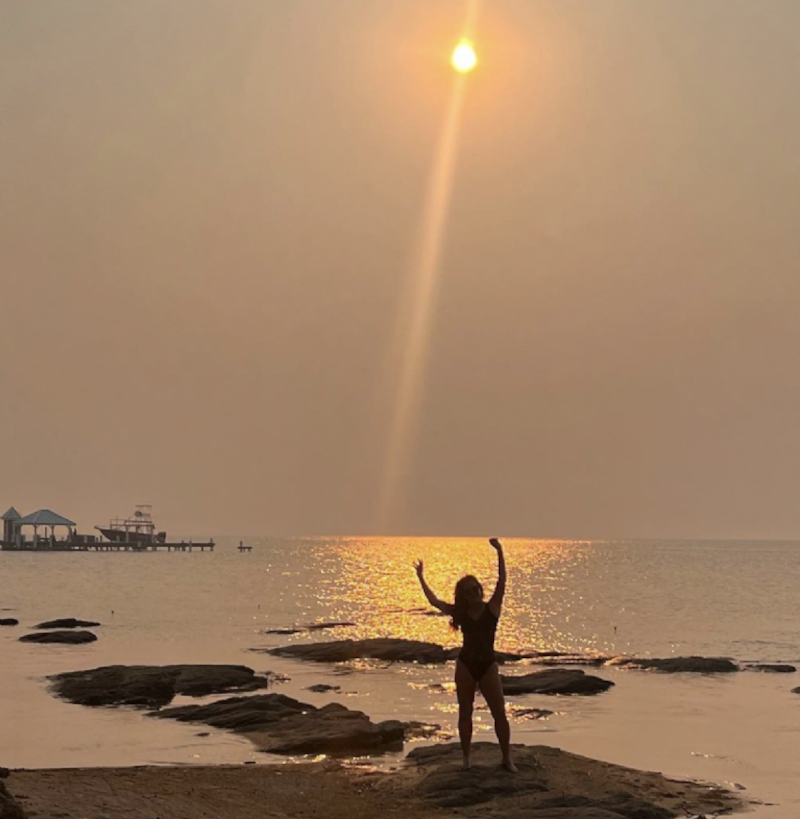 La periodista compartió que está en Roatan y subió a su cuenta de Instagram personal una serie de fotos en las que se ve el atardecer, en otra se ve su figura en traje de baño y también dejó en claro lo mucho que disfruta de la playa: “Pure vitamin sea”.