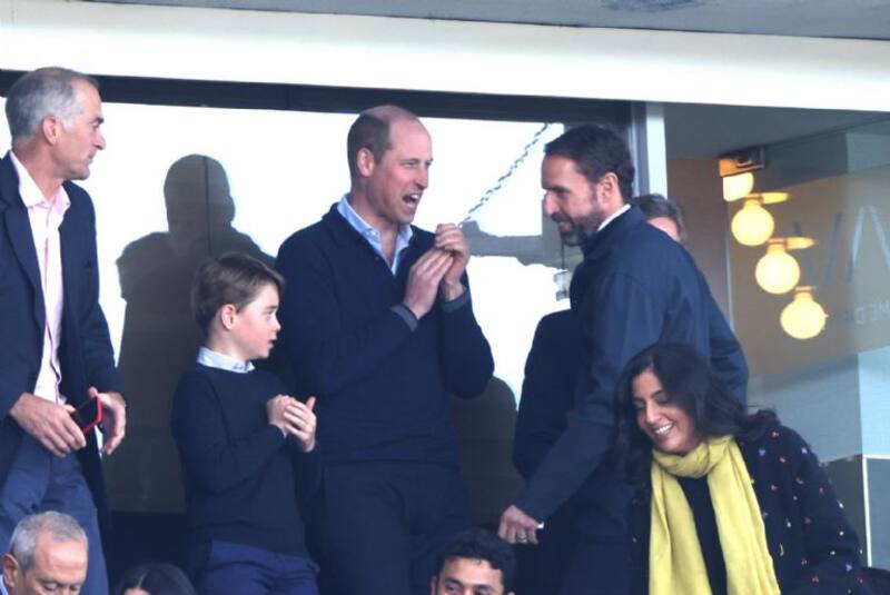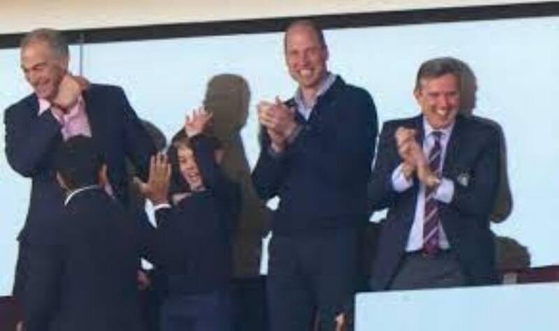 George no llegó al estadio con los colores burdeos y celeste del club, sino que se lo vio con una camisa de cuello a rayas, un jersey negro y un pantalón azul. El príncipe de Gales también lució un jersey azul marino y una camisa celeste de cuello abierto.