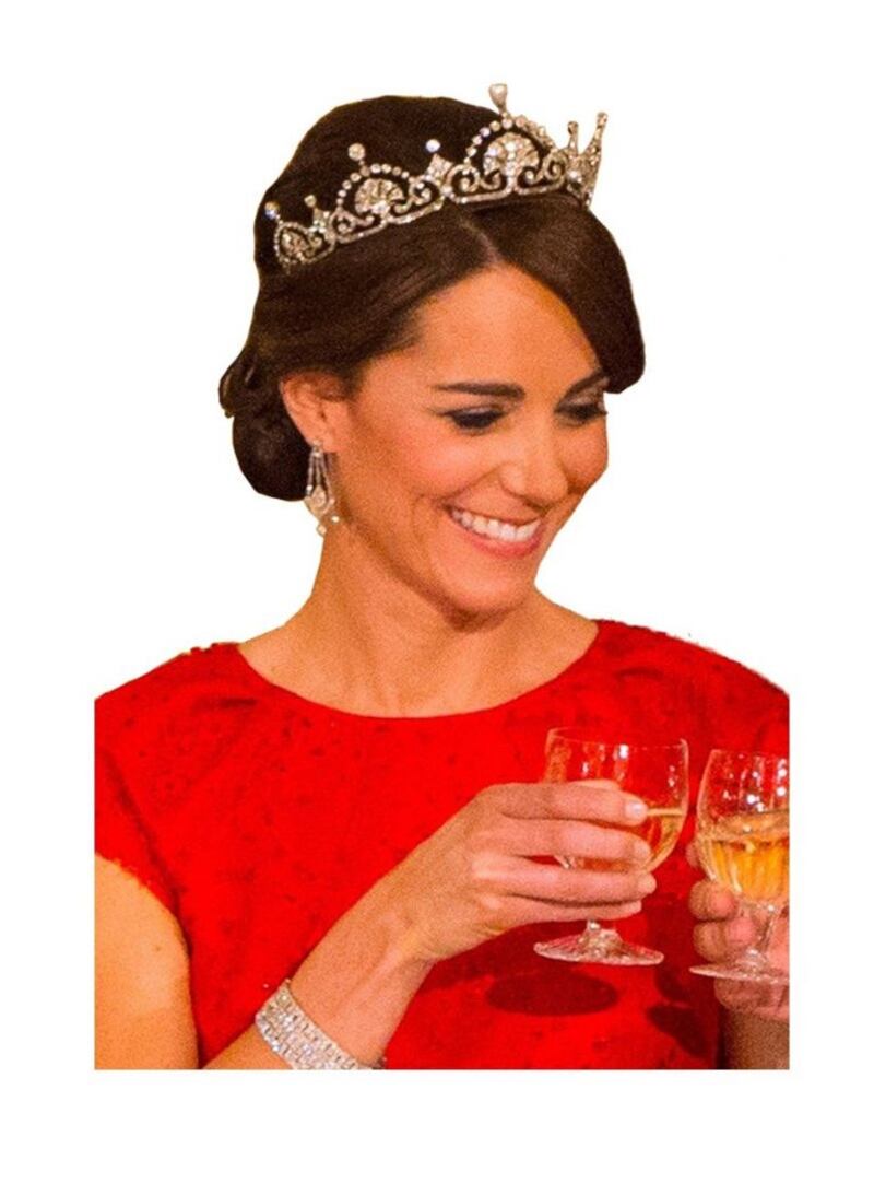 Kate usó la tiara Cartier Halo, prestada por la Reina Isabel II, el día de su boda, en 2011. Cercanos a la familia confirmaron que la princesa de Gales originalmente quería llevar una corona de flores, siguiendo los pasos de su madre Carole, quien llevó flores en el pelo cuando se casó con el padre de Kate, Michael, en 1980.