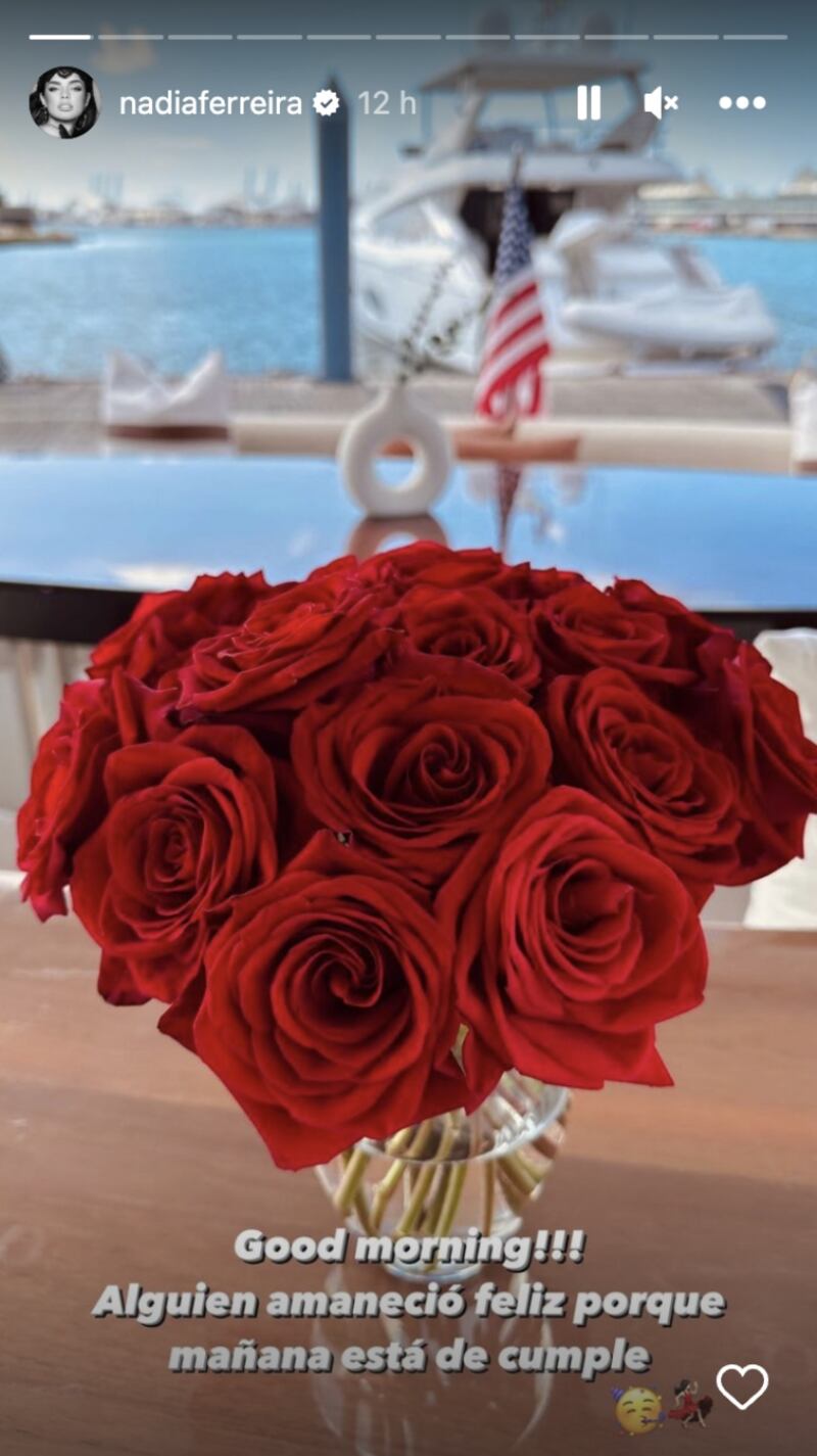Para arrancar los festejos del cumpleaños número 24 de Nadia Ferreira, la pareja organizó el fin de semana pasado un almuerzo muy íntimo en el yate del cantante en el que recibieron a algunos de sus amigos más cercanos como la influencer Lele Pons, Guaynaa y Stefi Roitman. Asimismo, la modelo presumió en redes sociales el ramo de rosas que su esposo le envió: "Good morning, alguien amaneció feliz porque mañana está de cumple" escribió Nadia en una historia de Instagram.