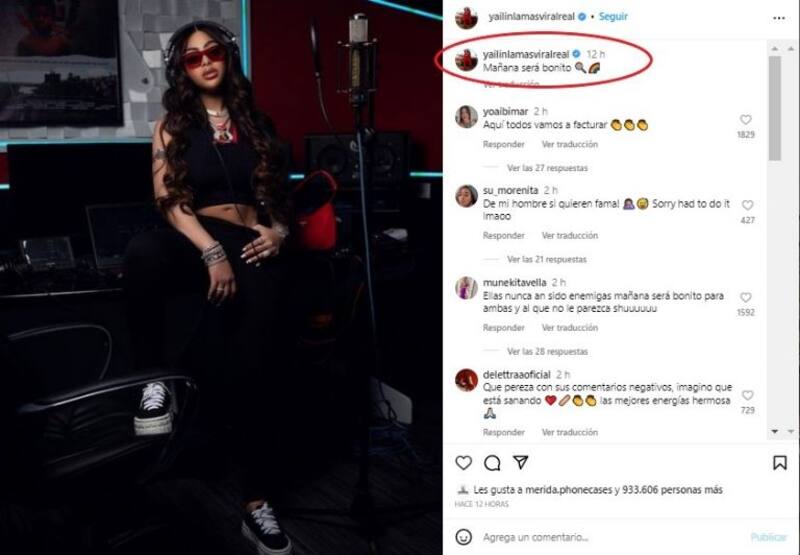 A través de su cuenta oficial de Instagram, la dominicana escandalizó a sus fanáticos al postear una fotografía con un claro guiño a la intérprete de Tusa. En la publicación, Yailin aparece en un estudio de grabación y con una frase que llamó poderosamente la atención de los usuarios: “Mañana será bonito”, dicha frase es el nombre del último álbum de la colombiana y que tras el lanzamiento se mantiene como uno de los más escuchados en lo que va de año.