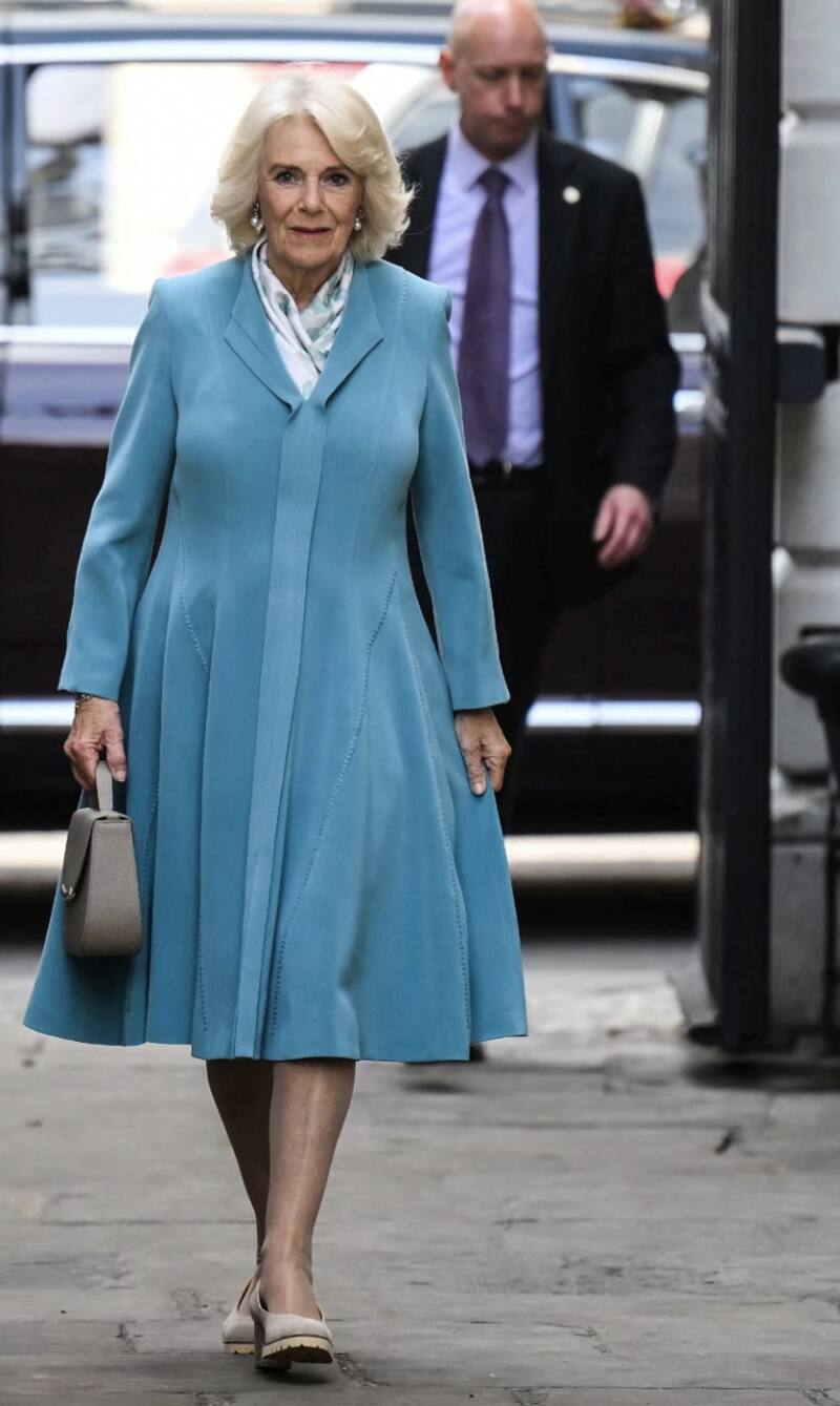 Camila portó un vestido de abrigo turquesa y un pañuelo de seda blanco, accesorizando con un bolso de asa superior de Charlotte Elizabeth, una pequeña marca británica que está entre las favoritas de la esposa del príncipe Harry.