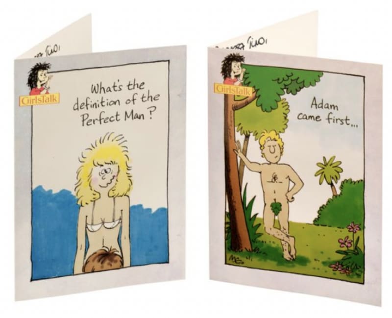 La primera tarjeta tenía una caricatura de un hombre desnudo apoyado en un árbol con la leyenda "Adán fue primero... ¡Los hombres siempre lo hacen!". La segunda mostraba a una mujer sin ropa con el mensaje "¿Cuál es la definición del Hombre Perfecto?", seguido de la respuesta: "¡Un enano con una lengua de 10" que puede respirar por las orejas!".