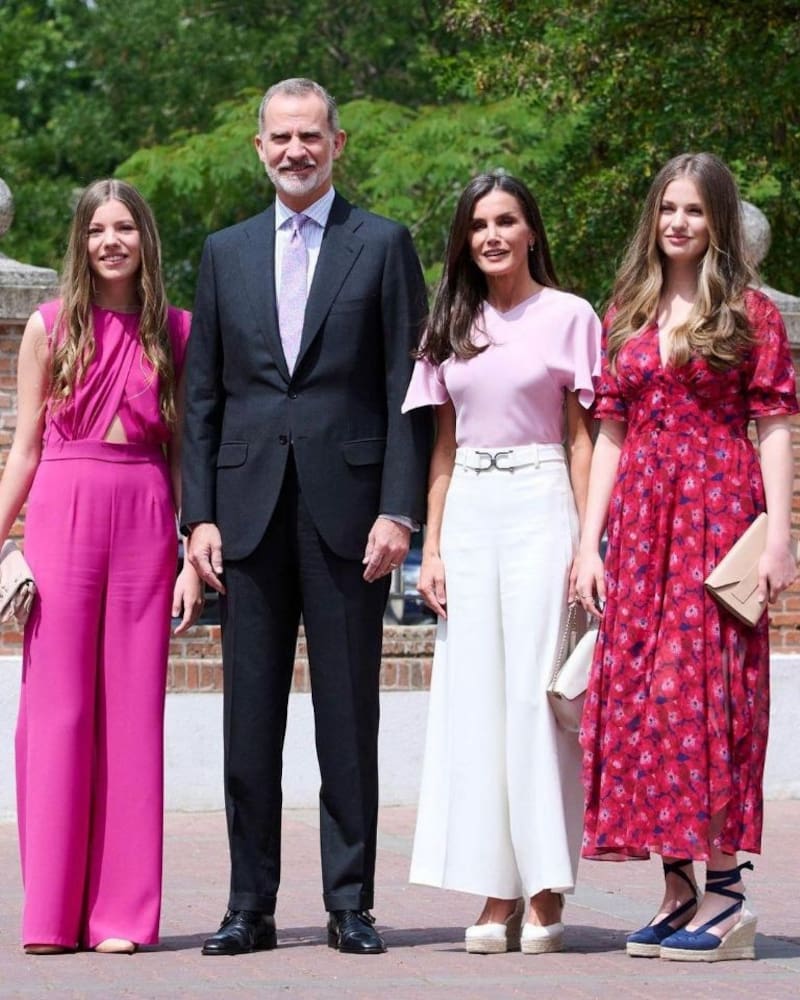 Sin duda, la infanta acaparó con su atuendo y el llamativo color, aunque su familia no se queda atrás, ya que la reina Letizia (50) optó por un entero blanco, mientras que la princesa Leonor (17) usó un vestido largo en rosa también con estampado floreado pero con un discreto y profundo escote en V que también se robó las miradas.