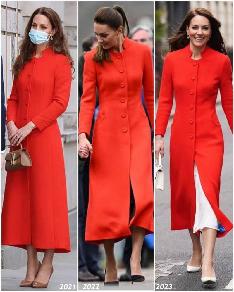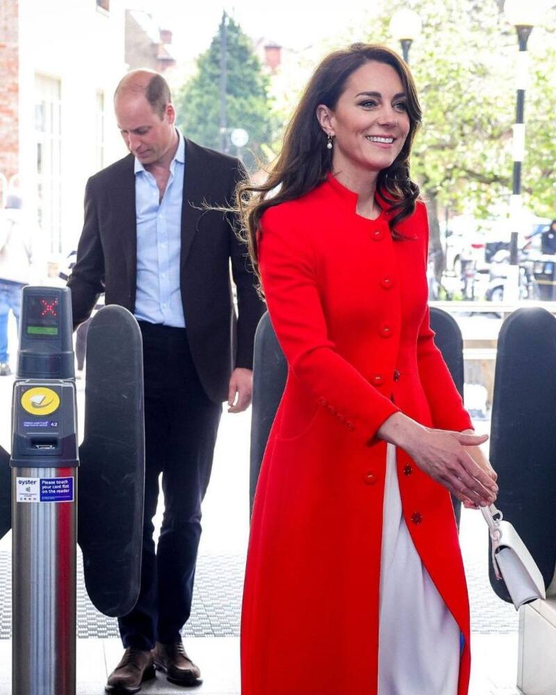 La princesa como siempre lució radiante en su visita con dos de sus atuendos favoritos, un vestido blanco de Suzannah London, ‘Flippy Wiggle Dress' que usó por primera vez en Wimbledon en 2019 y un largo abrigo rojo de Eponine London, un abrigo de lana crepe con collar mandarín con el cual también se le ha visto en varias ocasiones.