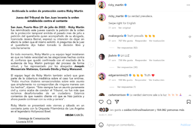 De momento Ricky Martin no ha hecho pronunciamiento alguno sobre el tema y en sus redes sociales sólo hay promocionales de sus conciertos. El cantante tiene tres hijos y está casado por el artista Jwan Yusef.
