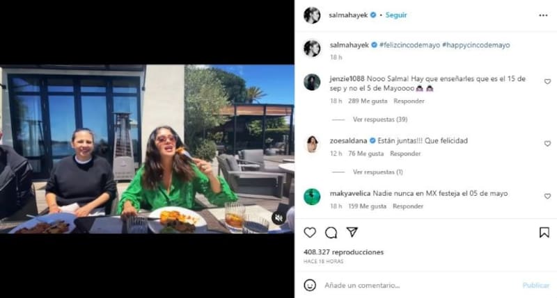 “Nooo Salma! Hay que enseñarles que es el 15 de sep., y no el 5 de Mayoooo”, “Nadie nunca en MX festeja el 05 de mayo”, “Sabes Salma que los Mexicanos NO celebramos como tal el 5 de Mayo. Que oso!”, “Se te olvidó lo mexicana !”, “Dijo nunca ningún Mexicano… jajajaja esto se me hizo muy gringo de tu parte”, fueron algunos de los comentarios que se puede leer en su publicación.