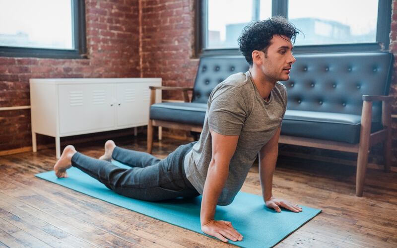 Presiona las manos hacia abajo y levanta el pecho del suelo, estirando suavemente la espalda.