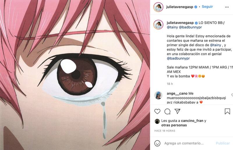 "Hola gente linda! Estoy emocionada de contarles que mañana se estrena el primer single del disco de @tainy, y estoy feliz de que me invitó a participar, en una colaboración con el genial @badbunnypr", escribió por su parte la intérprete de Limón y Sal. Aunque Venegas no dudó en mostrarse emocionada, pronto comenzaron a lloverle críticas por su incursión en el reguetón.