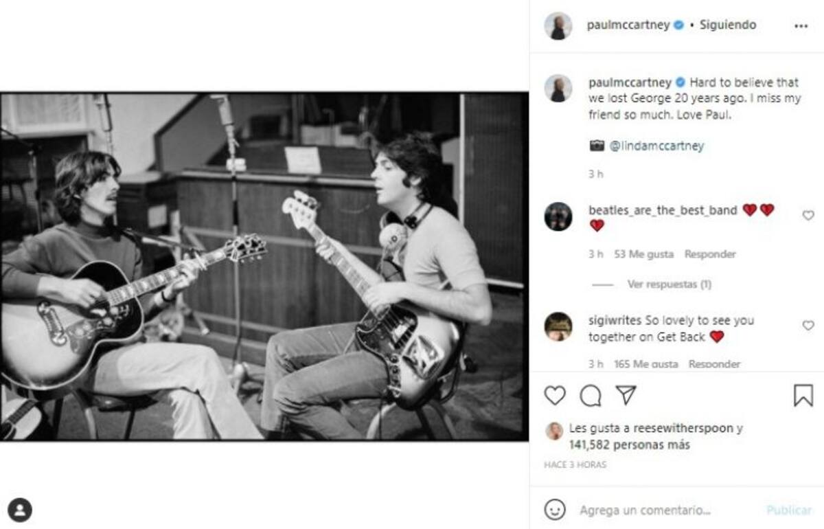 Luego fue Paul McCartney el encargado de homenajear a su compañero. "Hard to believe that we lost George 20 years ago. I miss my friend so much. Love Paul" ("Es difícil de creer que perdimos a George hace 20 años. Te extraño mucho mi amigo. Amor, Paul"), le refirió la leyenda viviente acompañando una fotografía de fines de los '60, cuando ya el grupo comenzaba a divorciarse. La imagen, además, corresponde a una fotografía que tomó Linda, la fallecida esposa de Paul McCartney.