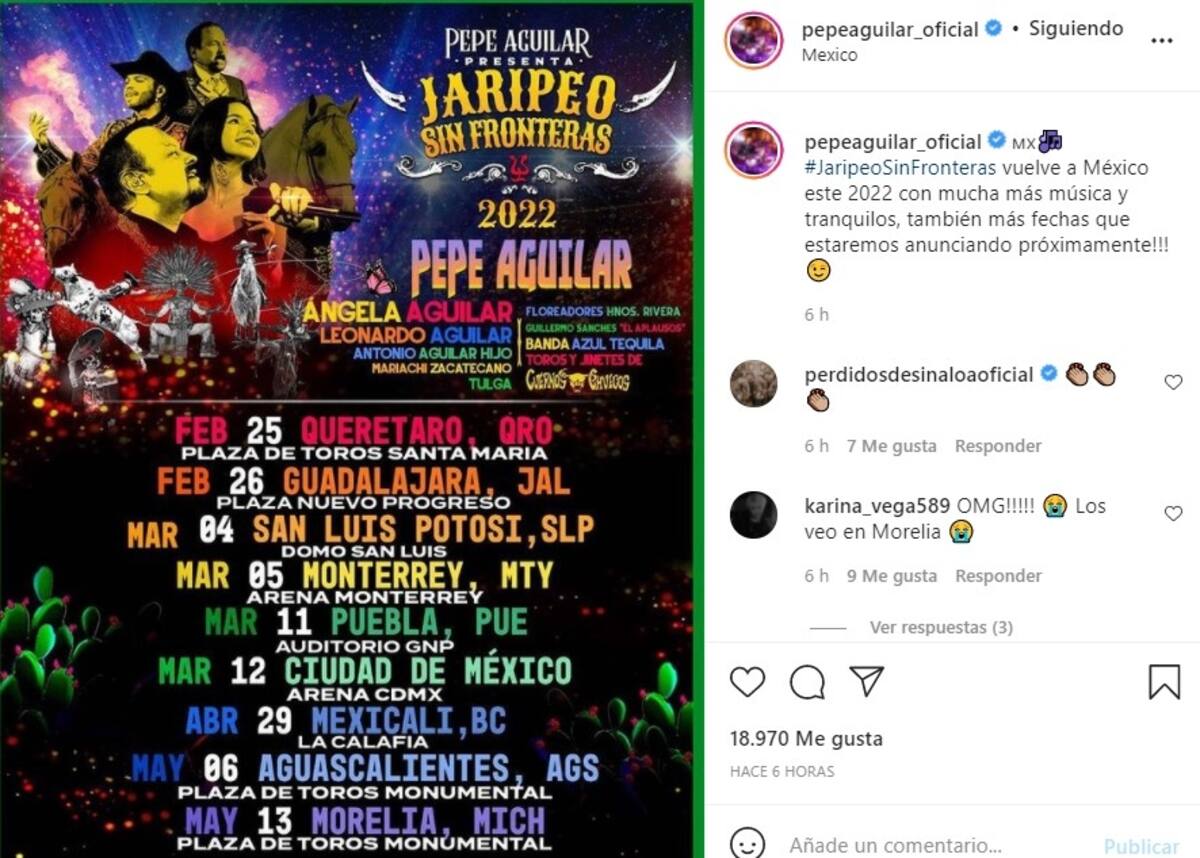 Pepe Aguilar aprovechó también la ocasión para postear a través de Instagram, las primeras fechas confirmadas para su gira 2022 por tierras mexicanas.