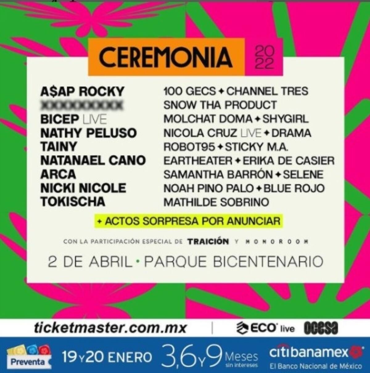 Después de dos años, el Festival Ceremonia regresa este próximo 2 de abril para llevarse a cabo en el Parque Bicentenario de la Ciudad de México y es A$AP Rocky, el hombre que se robó el corazón de Rihanna, quien encabeza la alineación de artistas que se presentarán en este show musical que albergará a grandes estrellas, entre ellos algunos mexicanos y ganadores del Grammy.