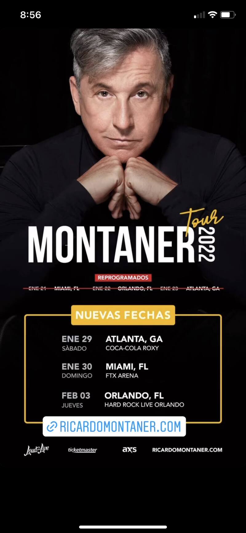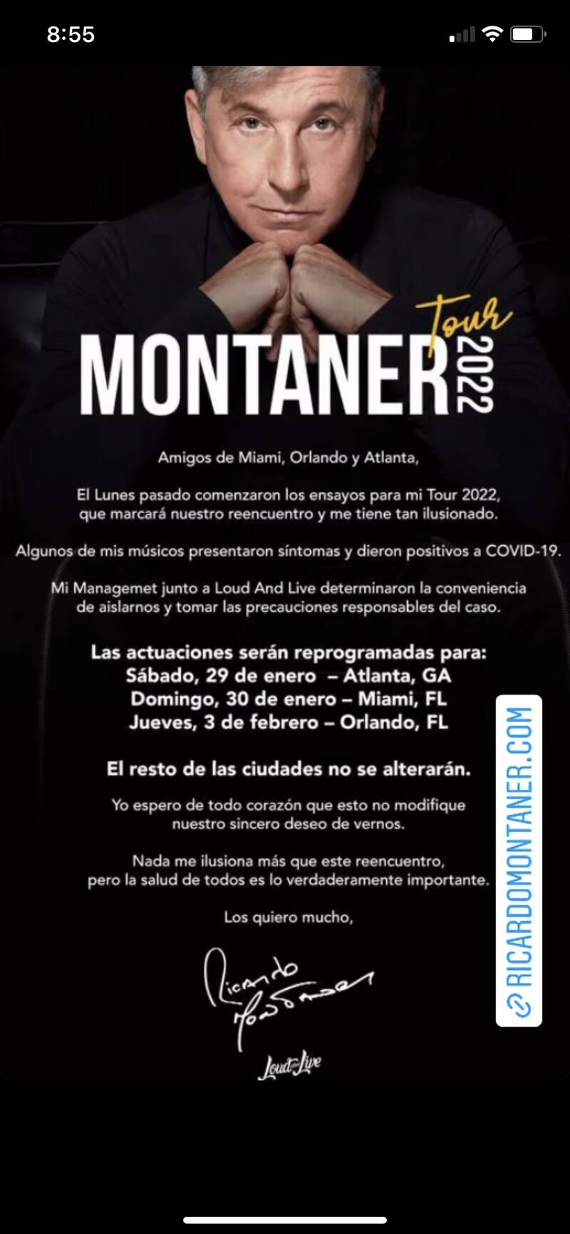 Ricardo Montaner empezaría en el próximo 21 de enero en Miami, Florida, las presentaciones de su tour Montaner 2022; sin embargo, estas tuvieron que reagendarse debido que el cantante tiene la sospecha de haberse contagiado de Convid-19.