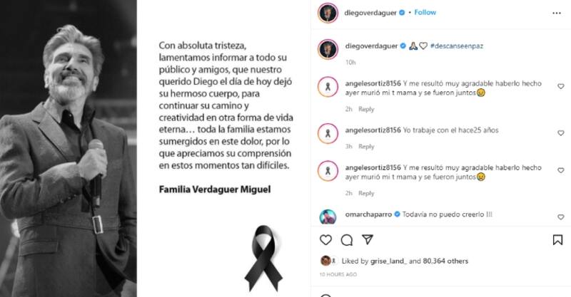 “Hoy se conmemora el #DíaDelCompositor, aplaudo a todos mis colegas que tienen el don de expresarse a través de la música. ¡Gracias por crear obras fantásticas!”, fue lo que escribió Verdaguer en su publicación que el día de hoy se ha llenado de emotivos mensajes de los fans de Diego, quienes también están de luto.