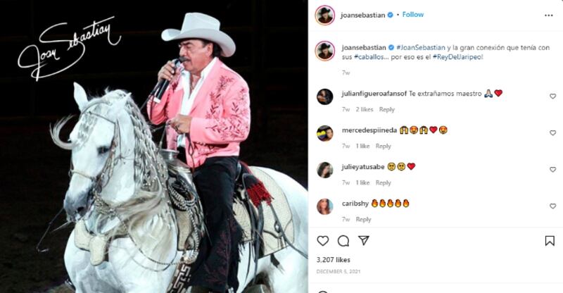 En la fotografía que el mismo Diego subió hace unos días a su cuenta de Instagram se puede ver al cantante Juan Gabriel sentado, muy sonriente y observando a su colega Joan Sebastian, quien sostiene una guitarra. Diego Verdaguer está de pie y también se muestra feliz durante esa reunión de grandes talentos.