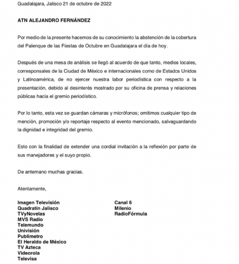 En redes sociales fue difundido un comunicado en el que representantes de diversos medios de comunicación tanto de México como de Estados Unidos aseguraron que ante la constante negativa de Alejandro Fernández de no atender a la prensa el gremio se unió para no darle cobertura a sus presentaciones.
