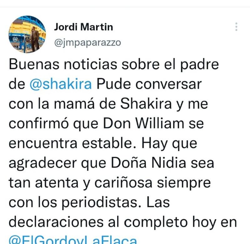 “Buenas noticias sobre el padre de @shakira. Pude conversar con la mamá de Shakira y me confirmó que Don William se encuentra estable. Hay que agradecer que Doña Nidia sea tan atenta y cariñosa siempre con los periodistas”, escribió Jordi en su cuenta de Twitter anunciando que por hora la salud de Mebarak está estable, lo que tendrá a la compositora contenta después de las veces que ha pedido la recuperación de su padre.