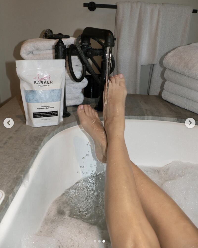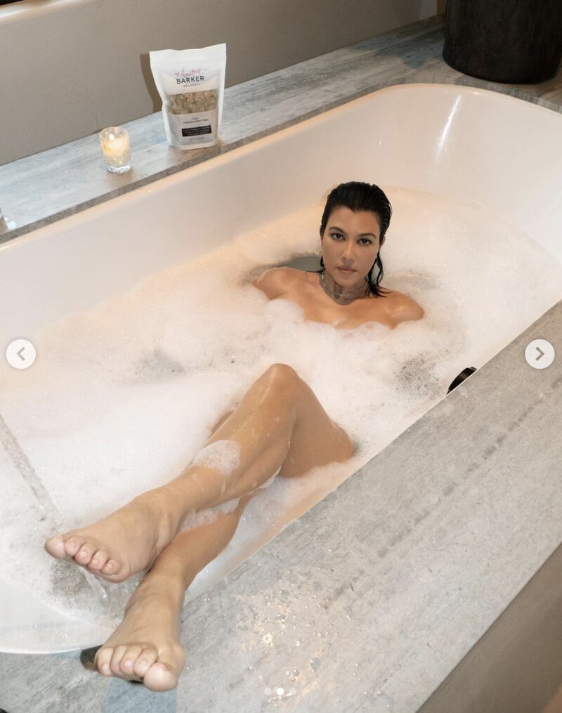 Como parte de la promoción de sus productos Barker Wellness, el integrante de Blink-182 compartió fotos en Instagram de la mayor de las hermanas Kardashian en una bañera con sus pies posados al frente.