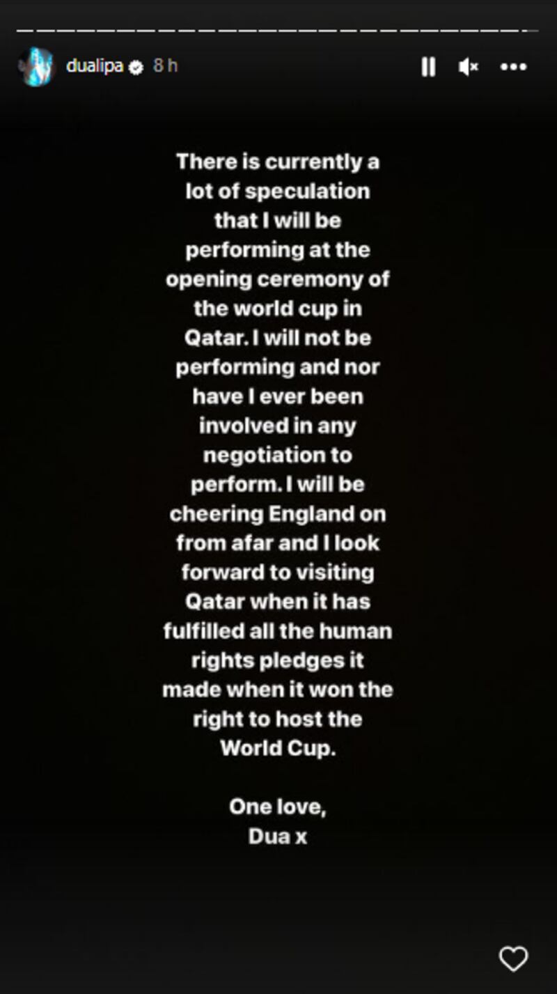 La intérprete de Levitating recurrió a sus historias de Instagram para hablar sobre el tema y desmintió que participará en el magno evento. Asimismo, recalcó que nunca estuvo involucrada en alguna negociación con los organizadores de la ceremonia para poder presentarse en el mundial.