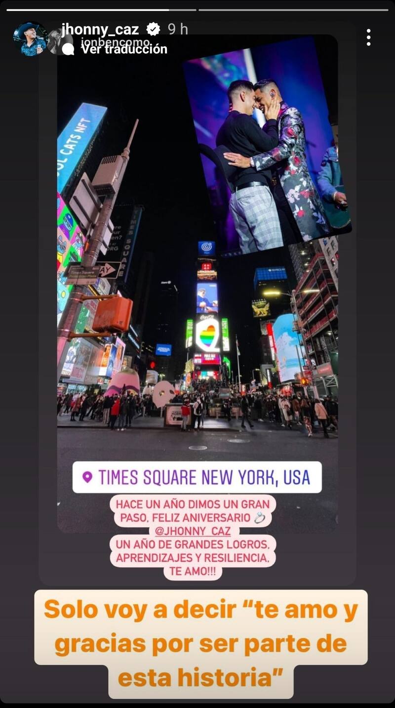 "Hace un año dimos un gran paso. Feliz aniversario @jhonny_caz. Un año de grandes logros, aprendizajes, y resiliencia. ¡Te amo!", escribió el influencer en una historia en la que compartió una fotografía junto Jhonny en Nueva York; este día lo recuerdan con mucho amor pues fue el día en el que se comprometieron.