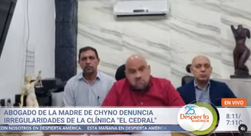 Durante un encuentro con la prensa, Horacio Morales, defensor legal de la progenitora de Chyno, ofreció unas palabras sobre la clínica privada El Cedral, ubicada en Caracas, Venezuela y donde actualmente se encuentra ingresado el intérprete de Mi Niña Bonita, asegurando que el centro de salud solicitó una alta cantidad de dinero para pagar el tratamiento que está recibiendo el cantante.