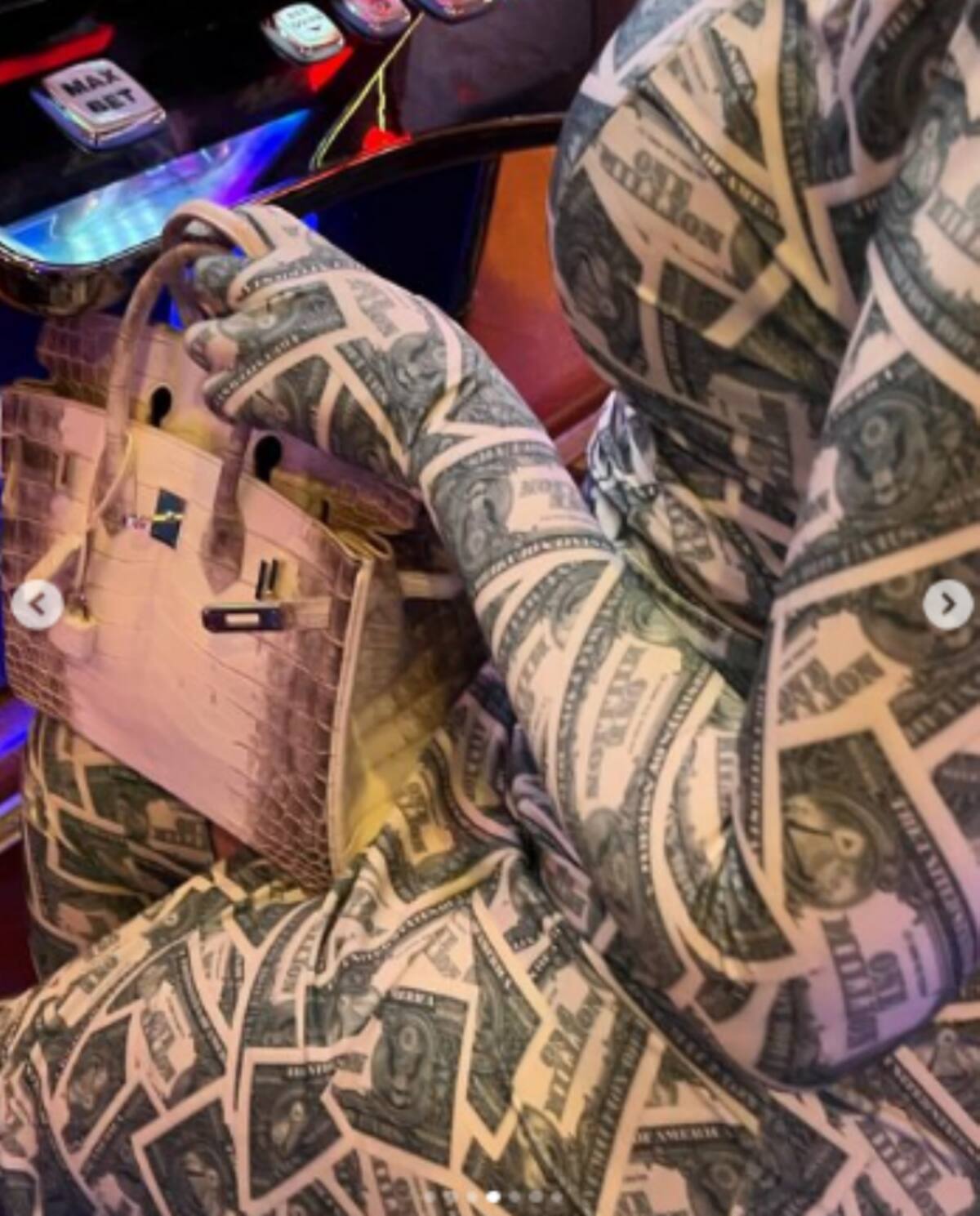En las imágenes, la modelo vistió una prenda bastante llamativa para sus seguidores, ya que, aunque era un traje enterizo, el diseño fue lo que captó la atención, pues llevaba estampado diversos billetes en dólares, haciendo alarde de su gran fortuna.