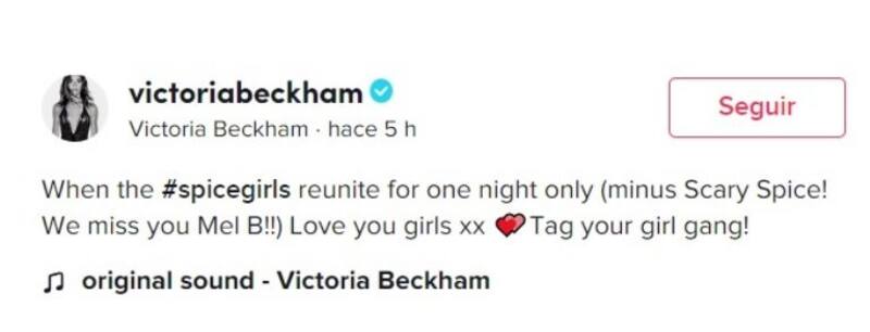 Este sábado las Spice Girls vivieron un especial momento que fue difundido a través de las redes sociales. Cuatro de sus cinco integrantes se reunieron en la fiesta de cumpleaños de Geri Horner. Mel B se convirtió en la gran ausente y por eso Victoria Beckham decidió enviarle un mensaje este lunes a través de su cuenta en TikTok.