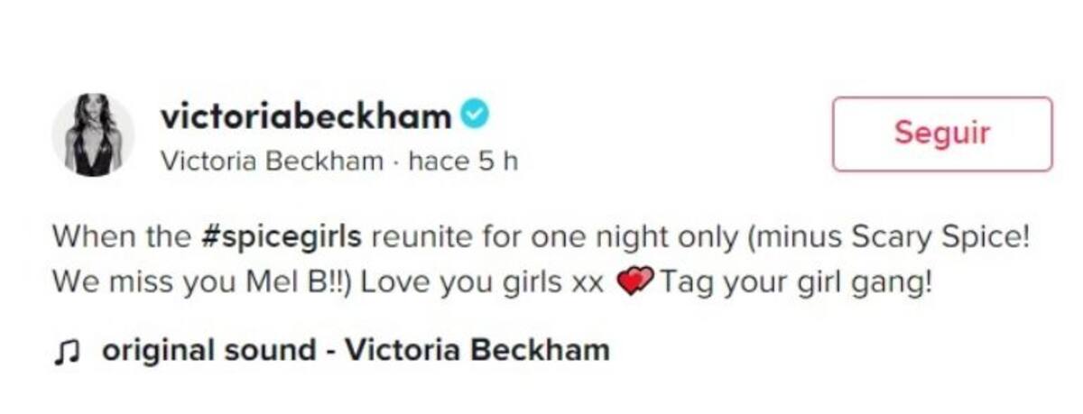 Este sábado las Spice Girls vivieron un especial momento que fue difundido a través de las redes sociales. Cuatro de sus cinco integrantes se reunieron en la fiesta de cumpleaños de Geri Horner. Mel B se convirtió en la gran ausente y por eso Victoria Beckham decidió enviarle un mensaje este lunes a través de su cuenta en TikTok.
