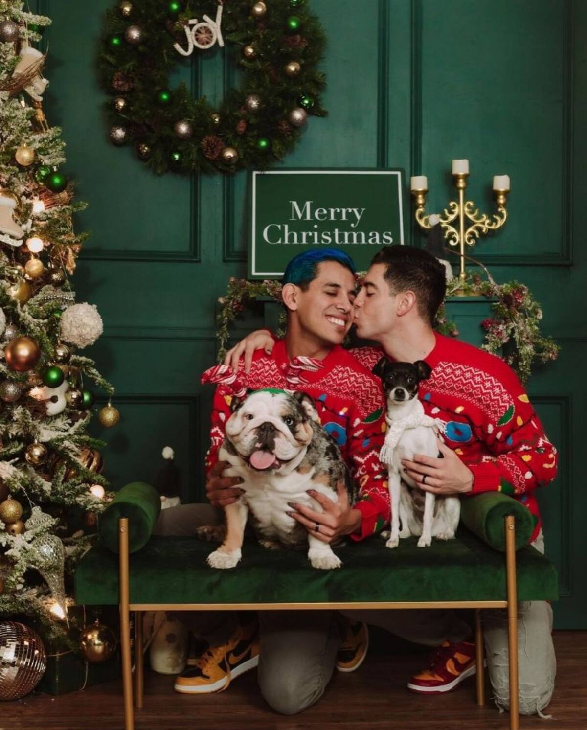“Que la pasen de lo mejor y que el amor nunca falte en sus casas”, agregaron. En las siguientes imágenes que postearon lucen otro look tipo duende con el que posan al lado de sus perros quienes también se volvieron protagonistas de estos retratos en los que la pareja plasmó a la familia que han formado.