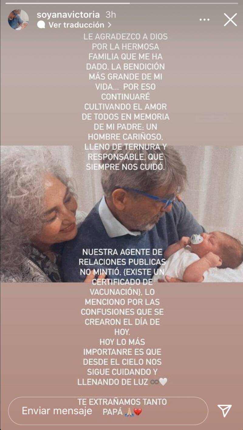"Nuestra agente de relaciones públicas no mintió, existe un "certificado de vacunación". Lo menciono por las confusiones que se crearon el día de hoy. Hoy lo más importante es que desde el cielo nos sigue cuidando y llenando de luz. Te extrañamos tanto papá", dijo en una de sus series de Instagram.