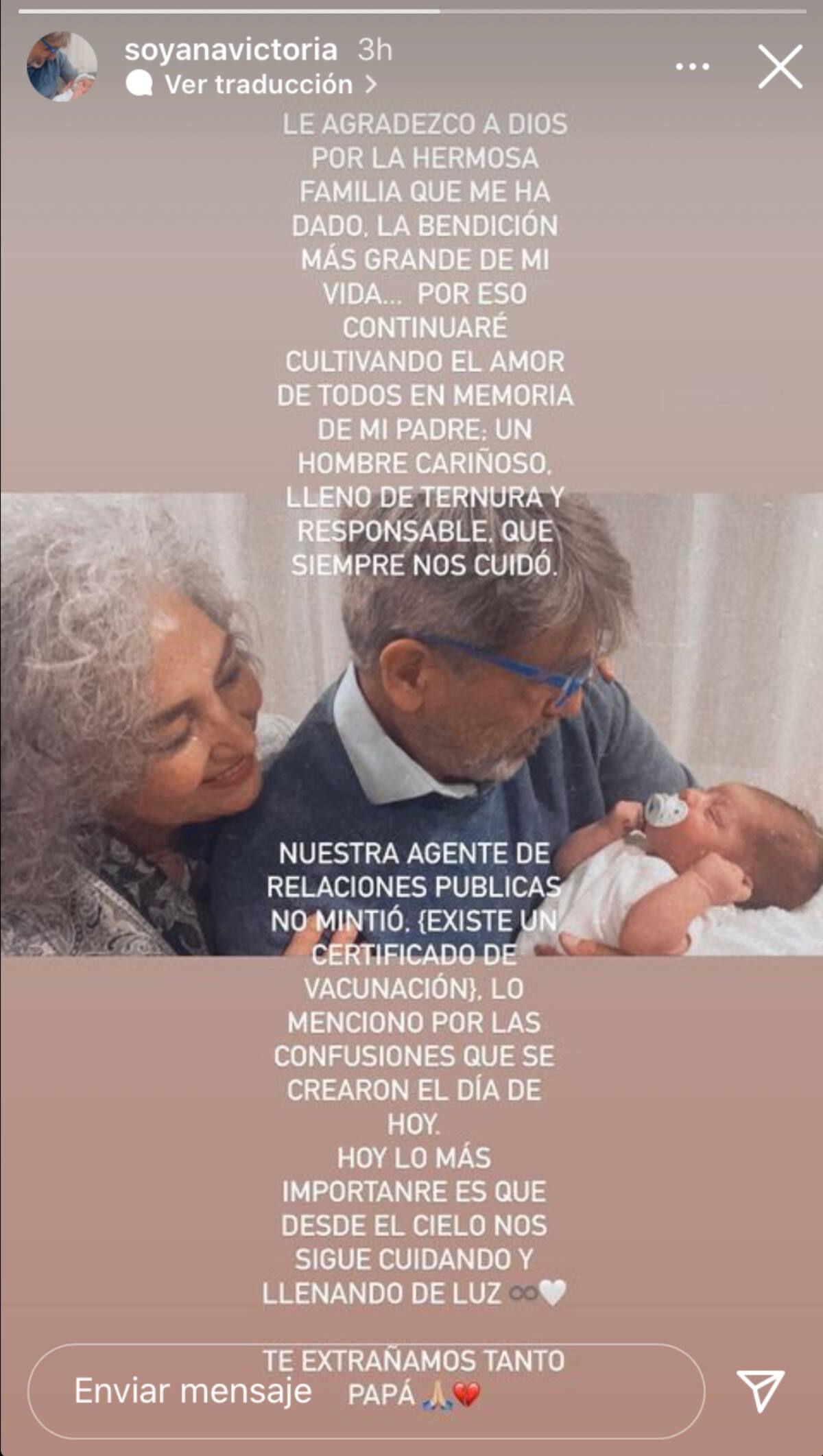 "Nuestra agente de relaciones públicas no mintió, existe un "certificado de vacunación". Lo menciono por las confusiones que se crearon el día de hoy. Hoy lo más importante es que desde el cielo nos sigue cuidando y llenando de luz. Te extrañamos tanto papá", dijo en una de sus series de Instagram.