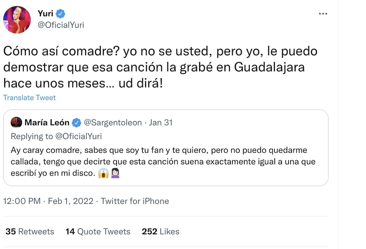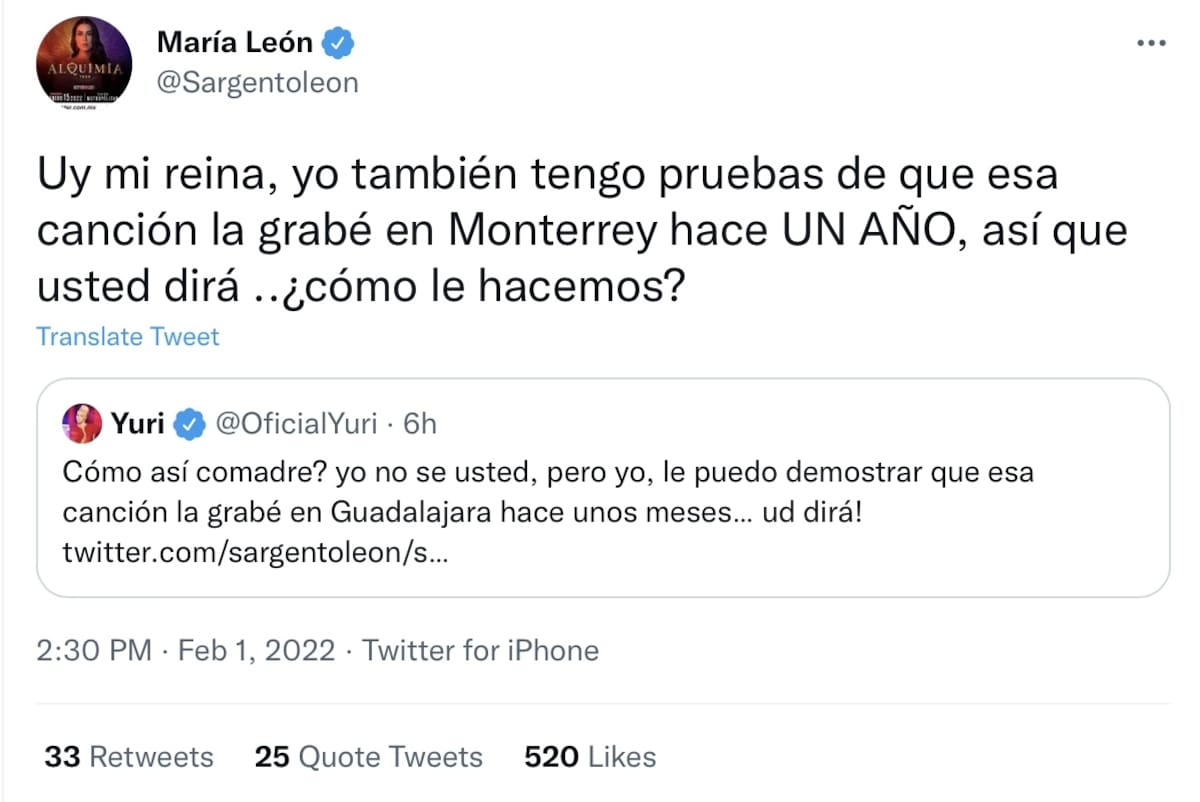 Sin embargo la ex vocalista de Playa Limbo volvió a comentar "Uy mi reina, yo también tengo pruebas de que esa canción la grabé en Monterrey hace UN AÑO, así que usted dirá ..¿cómo le hacemos?". Ambas son reconocidas cantantes en México y tienen gran número de seguidores en Latinoamérica.