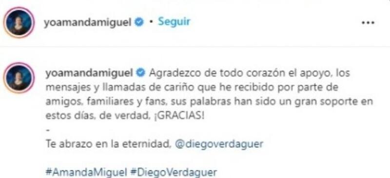 Amanda continuó con su mensaje manifestando que Diego siempre había visto por el bienestar de ella y su hija. “Diego Verdaguer, mi fiel compañero de vida, siempre se encargó de que Ana Victoria y yo estuviéramos bien”, escribió. Finalmente agradeció por todos los momentos vividos. “Se encargó de darnos todo y MÁS, nos llenó de felicidad, tranquilidad y alegría absoluta. Te extrañamos con el alma, mi amor. ¡Te amaré por siempre!”, finalizó.