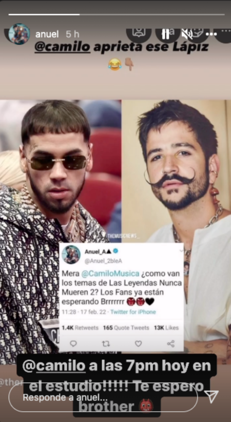 En el mensaje se ve una foto tanto de Anuel AA como de Camilo con una captura de pantalla del twitter del ex de Karol G que dice: “Mera @camilomusica ¿cómo van los temas de Las Leyendas Nunca Mueren 2? Los fans ya están esperando Brrrr”, además el músico urbano agregó: “Camilo, a las 7 hoy en el estudio, te espero Brother”.
