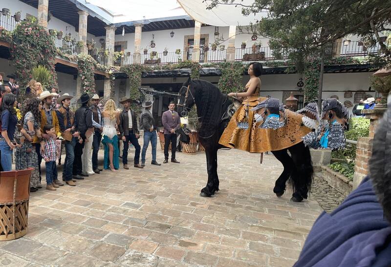 Ahora se han revelado nuevas fotografías de la cantante en el detrás de cámaras de su participación, en las cuales puede verse a Ángela sobre un caballo, mientras parte del elenco la mira con detenimiento.