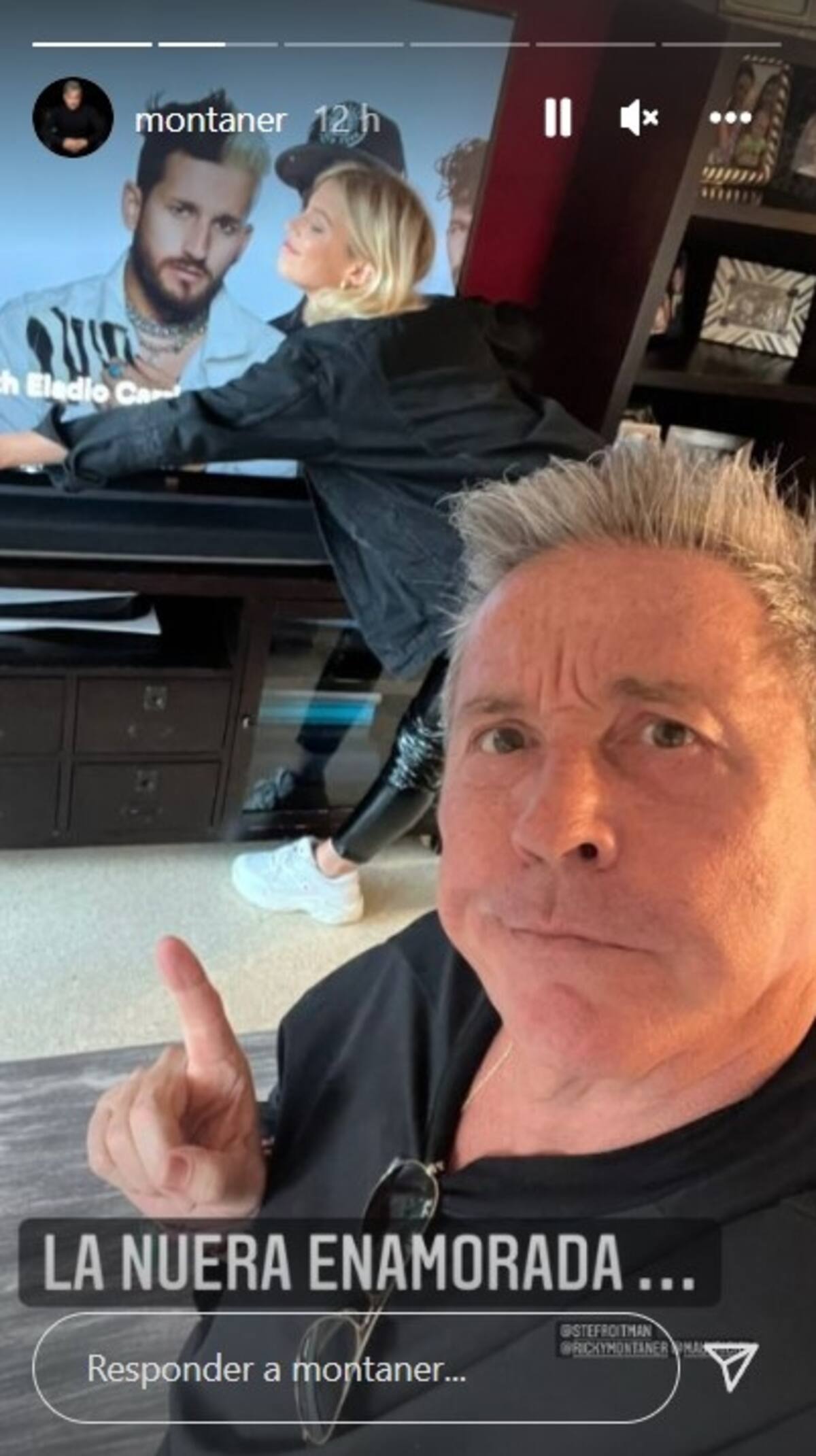 A través de una publicación, el compositor de Amén dejó en evidencia por quién se desvive la modelo argentina: "La nuera enamorada", escribió mientras su cara se mostraba "confundido" y detrás de él estaba Roitman abrazada del televisor en el momento justo que aparecía Ricky.
