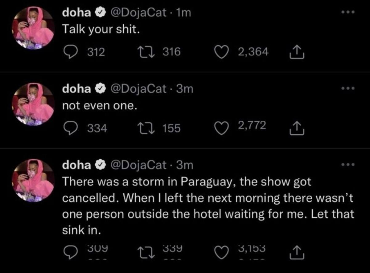 Otro usuario de Twitter cuestionó a Doja Cat por su falta de humildad, pues tras la cancelación de su concierto, organizó una fiesta privada en un bar y presuntamente pidió que nadie la mirara a los ojos, y ante los cuestionamientos, la cantante se defendió: "si tú supieras". Y aunque la estadounidense hizo varios comentarios, luego los borró.