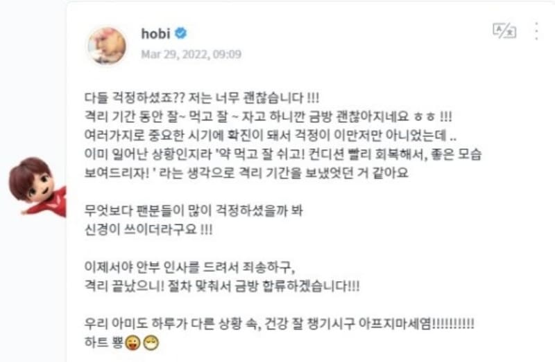 “¿Estaban todos preocupados? ¡Estoy bien! Comí y dormí bien durante el periodo de cuarentena, mejoraré pronto”, escribió. J-hope quien también informó que ya había pasado su tiempo de aislamiento. “Creo que las fans estaban más preocupadas que cualquier otra cosa, pero justo ahora se acabó la cuarentena y me uniré ustedes tan pronto como lo permita el procedimiento”, dijo.