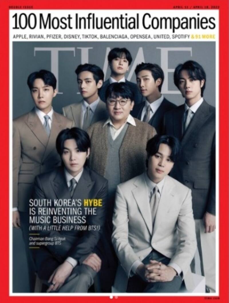 La publicación pone en portada a la agrupación y su creador como parte de las 100 compañías más influyentes. "Inicialmente fundada como Big Hit Entertainment en 2005 por el genio musical Bang Si Hyuk, la compañía cotiza públicamente en el mercado coreano en 2020 como HYBE; actualmente está valorada en 9.5 millones de dólares", menciona la revista.