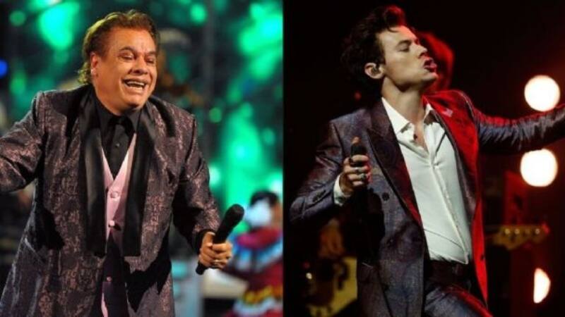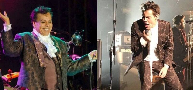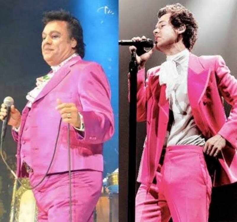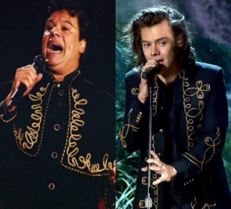 Aunque no sabemos si exista una conexión entre el británico, de 28 años de edad, y Juan Gabriel, fallecido en 2016 a la edad de 66 años, lo cierto es que los fans han encontrado que los trajes de Styles son casi idénticos a los que utilizó el “Divo de Juárez”. Aquí te dejamos algunas de las comparaciones que han hecho usuarios en redes sociales.